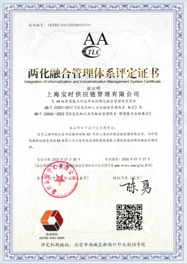 武义两化融合管理体系AA评定证书